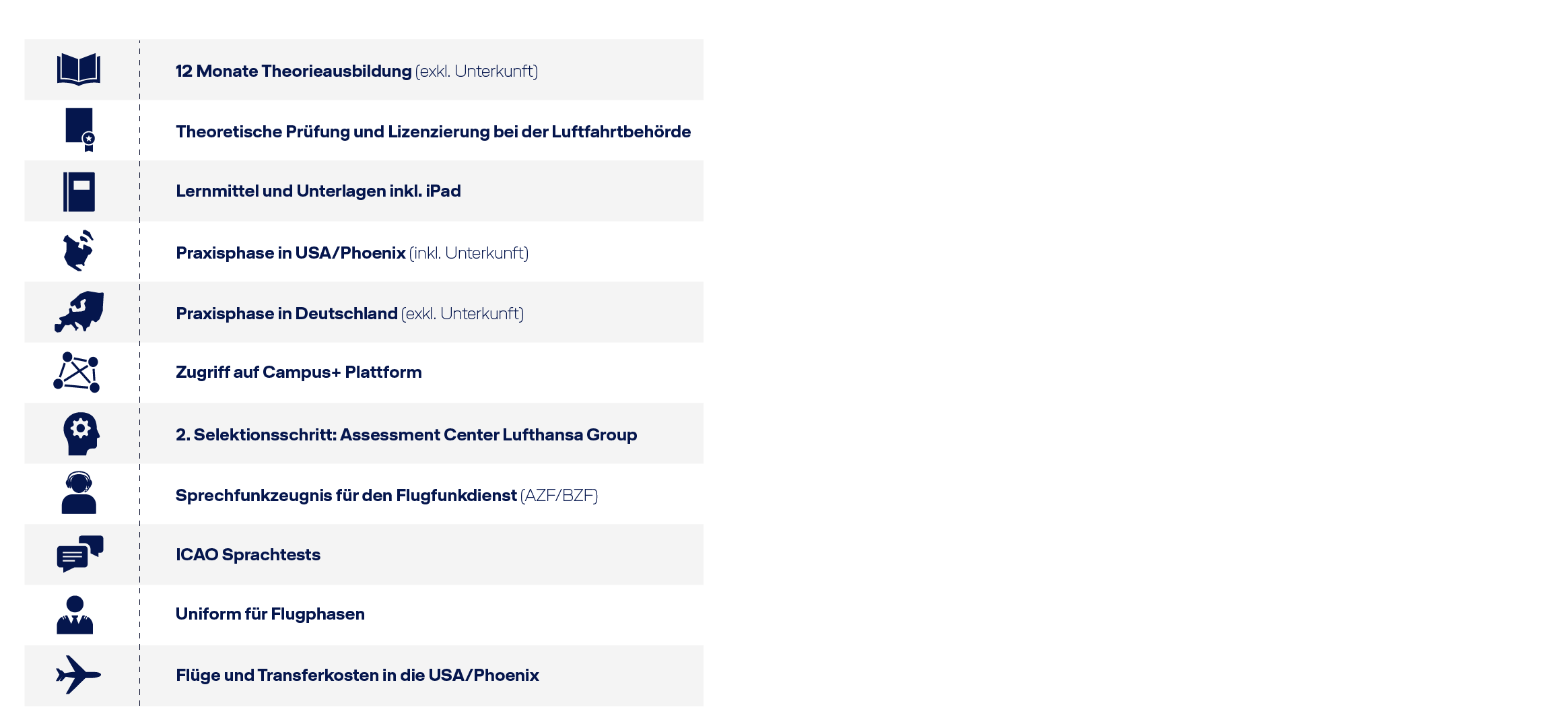 In den Schulungskosten sind viele Leistungen bereits enthalten: neben Theorieausbildung und Praxisphasen sind u.a. die Wohnheimkosten in den USA, die Reisekosten in die USA sowie die Uniformen im Preis inbegriffen. In der Tabelle findest du eine Auflistung der Leistungen, die in den Schulungskosten enthalten sind.